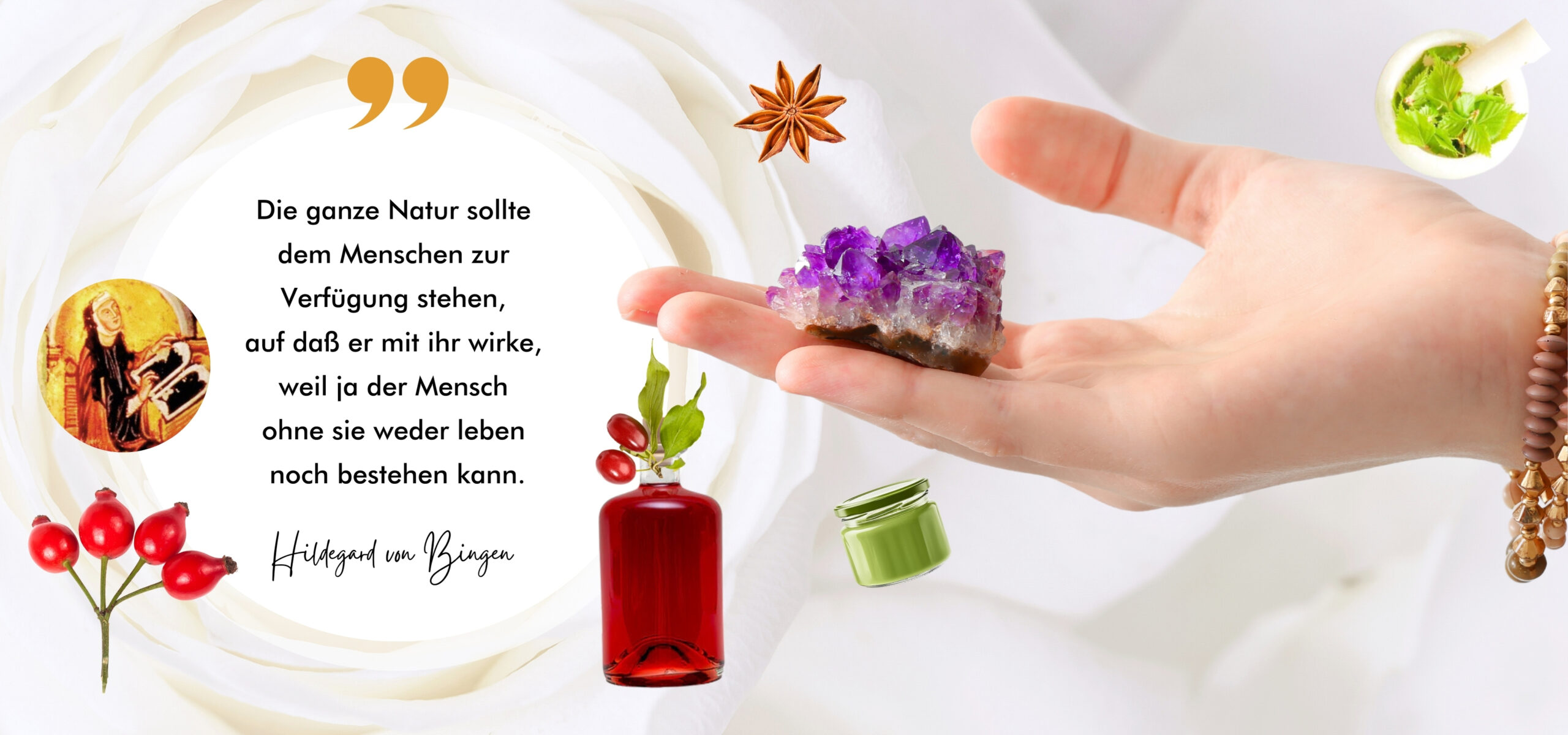 Darüber hinaus entdecken wir die Kraft der Naturheilkunde mit Heiltieren, Heilkristallen, Edelmetallen und Heilerden. Von Bienen bis Diamant und Amethyst bis Gold tauchen wir tief in die faszinierende Naturmedizin Hildegards ein und entdecken ihre besonderen Wirkungen für die Gesundheit.